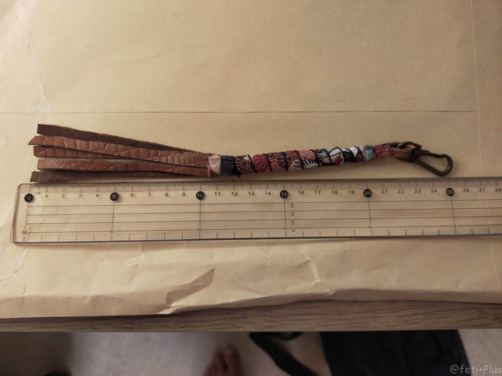 バラ鞭チャームは、全長25cm、房の長さと柄の長さがそれぞれ10cmです。柄の材質は木材、房の材質は一応本革です。