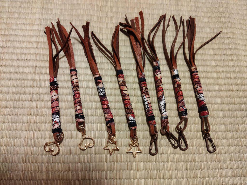 柄の上に房の革を巻いたあと、布テープを巻いてあります。小さいのと軽いのとで、叩いても痛くありません。チャームなのでバッグにつけたりして飾りとして使ってください。