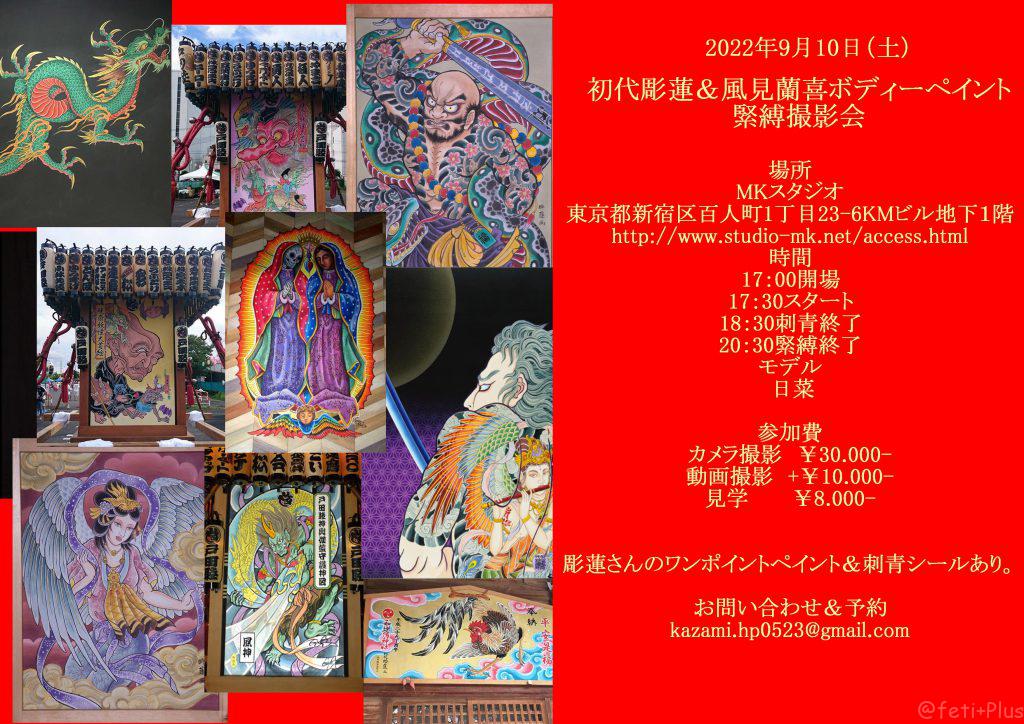 2022年9月10日にMKスタジオにて、初代彫連&風見蘭喜ボディーペイント緊縛撮影会が開催されます!