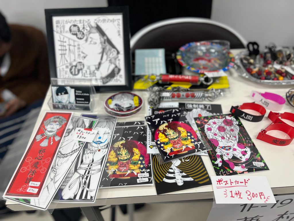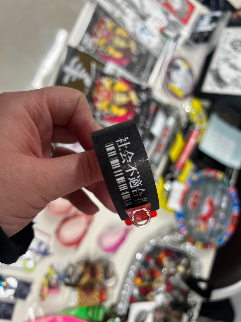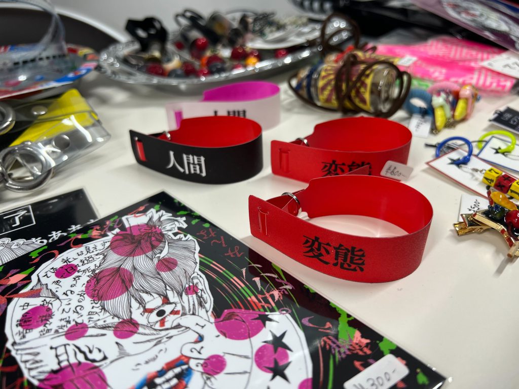 装着すると首にキリトリ線ができるチョーカーや、お札みたいなステッカー、どれも兼村さんワールド全開。リストバンドというのでしょうか?腕に巻くアイテムで「人間」と書いてあったので手に取って裏を見てみたら「社会不適合者」と書いてありました。これはまさしく私のことだわ!