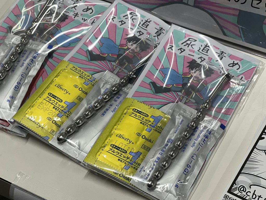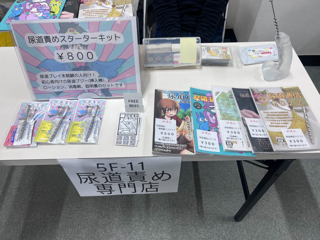 『はちんこすろっと』さんのお隣、『尿道責め専門店』さん(@cbtgoods)にもお邪魔しました~。『尿道責め専門店』さんでは、ノンフィクション尿道責め情報専門誌「尿道通信」のほか、「尿道責めスターターキット」を販売していました。