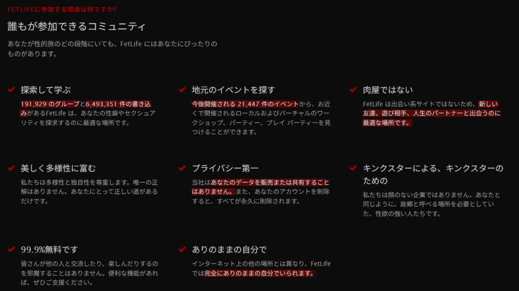 FetLifeはSNSとしての基本機能に加え、フェティッシュ文化に特化した交流が可能です。