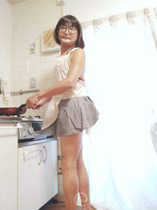 写真は自宅キッチンにて。築60年の公団住宅なので、ガステーブルはビルトインキッチンではありません。普段料理をするときはエプロンなしで普段着ですが、今回は公開するので水着エプロンで頑張っています♪