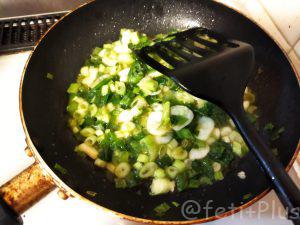 分量外のごま油をフライパンにひき、冷凍ネギとスライスしたにんにくを入れて炒めます。冷凍ネギも冷凍庫に常備しておくと買い物に行けないときに重宝します。
