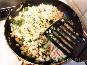 2.ネギとにんにくを炒め、大豆ミートを加える