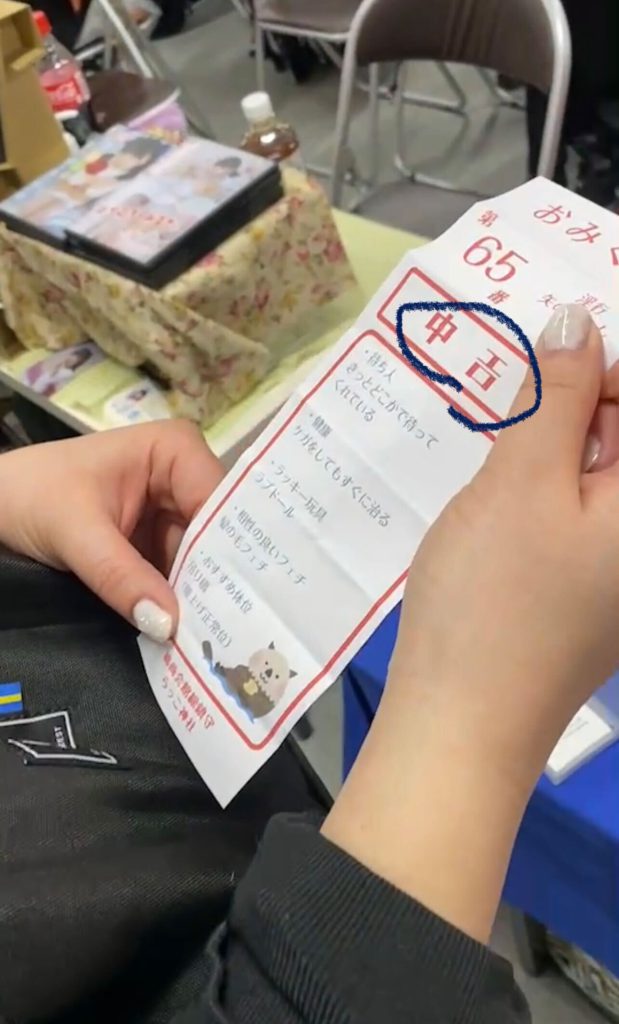 一緒にブースを回っていた文月みづきさん(@Pecotaranta)がおもむろにピンクのちんこを手に取り、ちょっといやらしい感じで上下に振ると出ました。おみくじ。「末吉かあ……びみょ~」と言いかけたら食い気味に