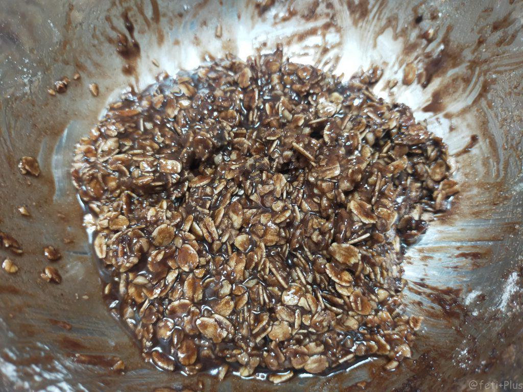 まず、種を作ります。オートミールと砂糖をまんべんなく混ぜ、更にオリーブ油を加えてよく混ぜます。