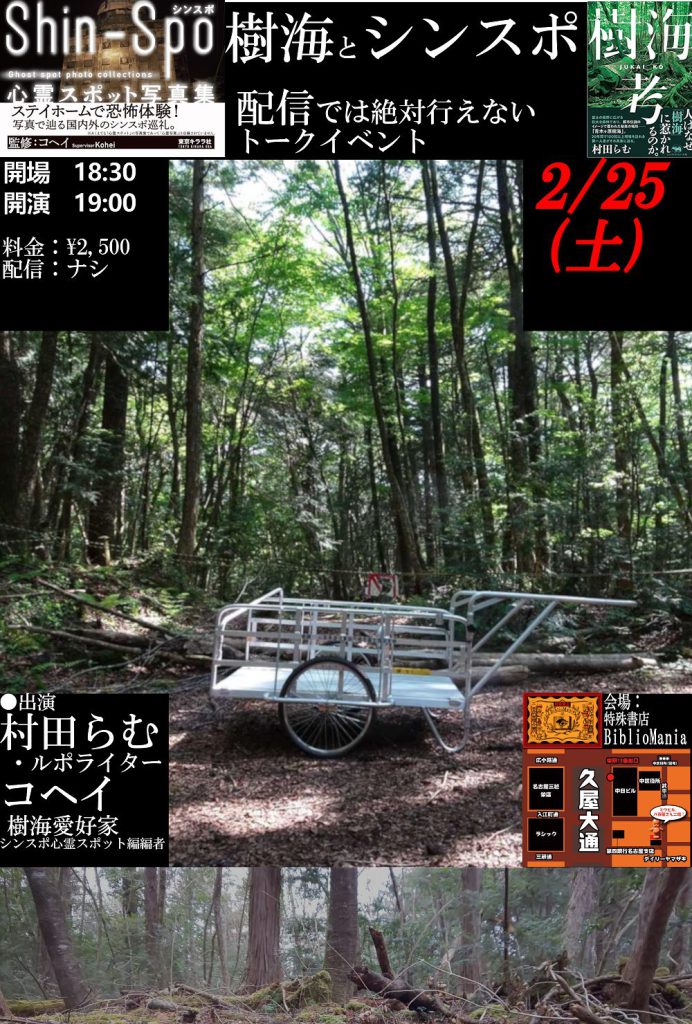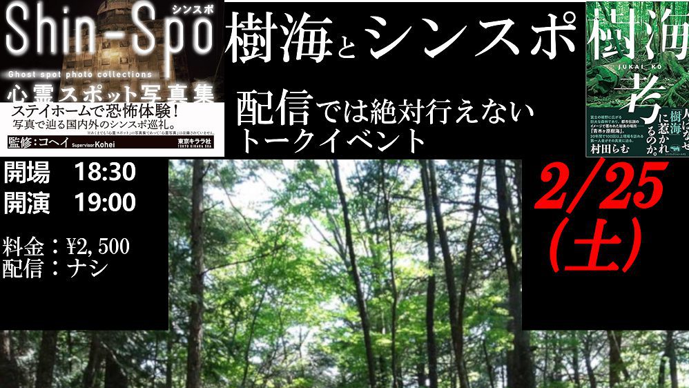 トークイベント『樹海とシンスポ』では、この写真集の監修者コヘイ氏と写真を提供した村田らむ氏が登壇。刺激が強すぎて本書に未収録となってしまった写真や配信では見せられない過激な画像とともに、樹海の探索を趣味とする二人が樹海探索で見たものや樹海のエピソードを語ります。