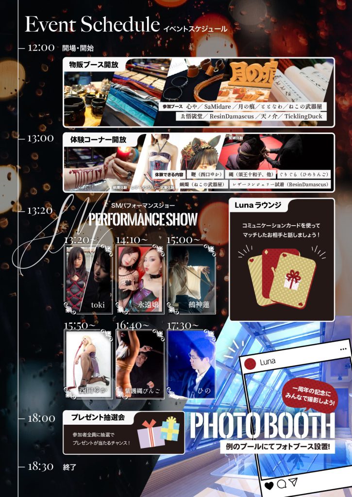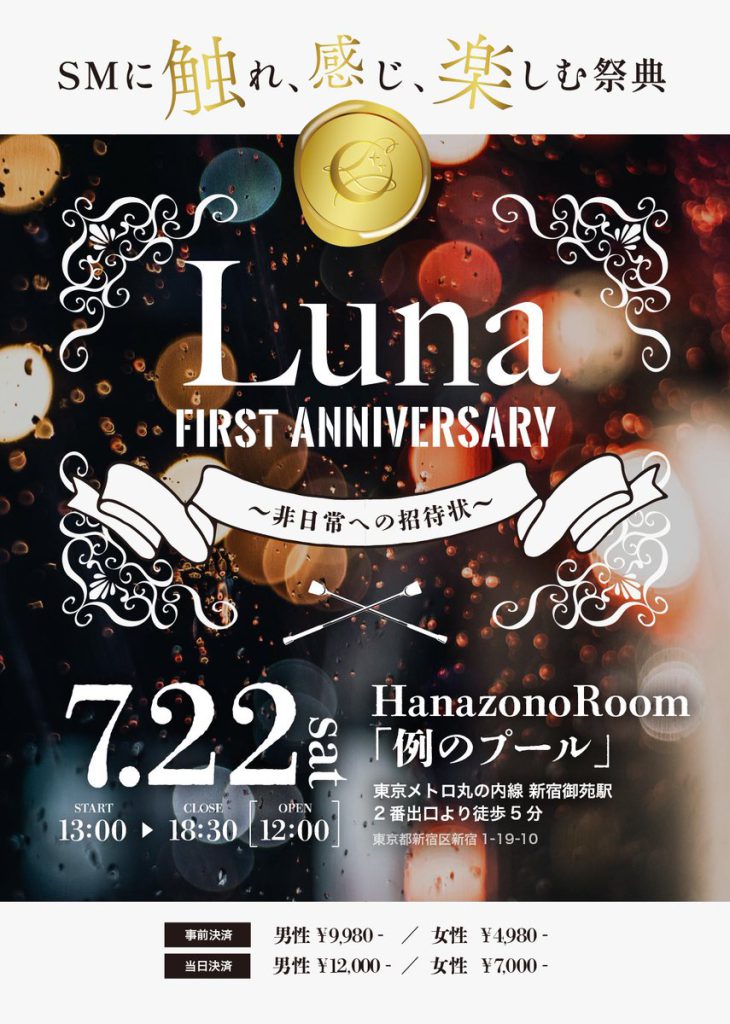 Lunaの1周年を祝う特別な1日。緊縛や鞭のショー、SMグッズ販売、蝋燭やくすぐりなどの体験コーナーとさまざまな催しが盛りだくさんの「SMに触れ、感じ、楽しむ祭典」となっております~。