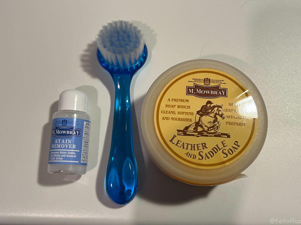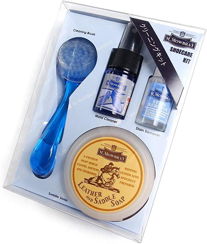 サドルドープ(皮革製品用石けん) 、クリーニングブラシ(ソープ・シャンプー用ブラシ)、ミニモールドクリーナー(革靴用カビクリーナー) 、ステインリムーバー(水性タイプ靴用汚れ落としスムースレザー用)がセットになっていて、amazonだと2,750円でした。