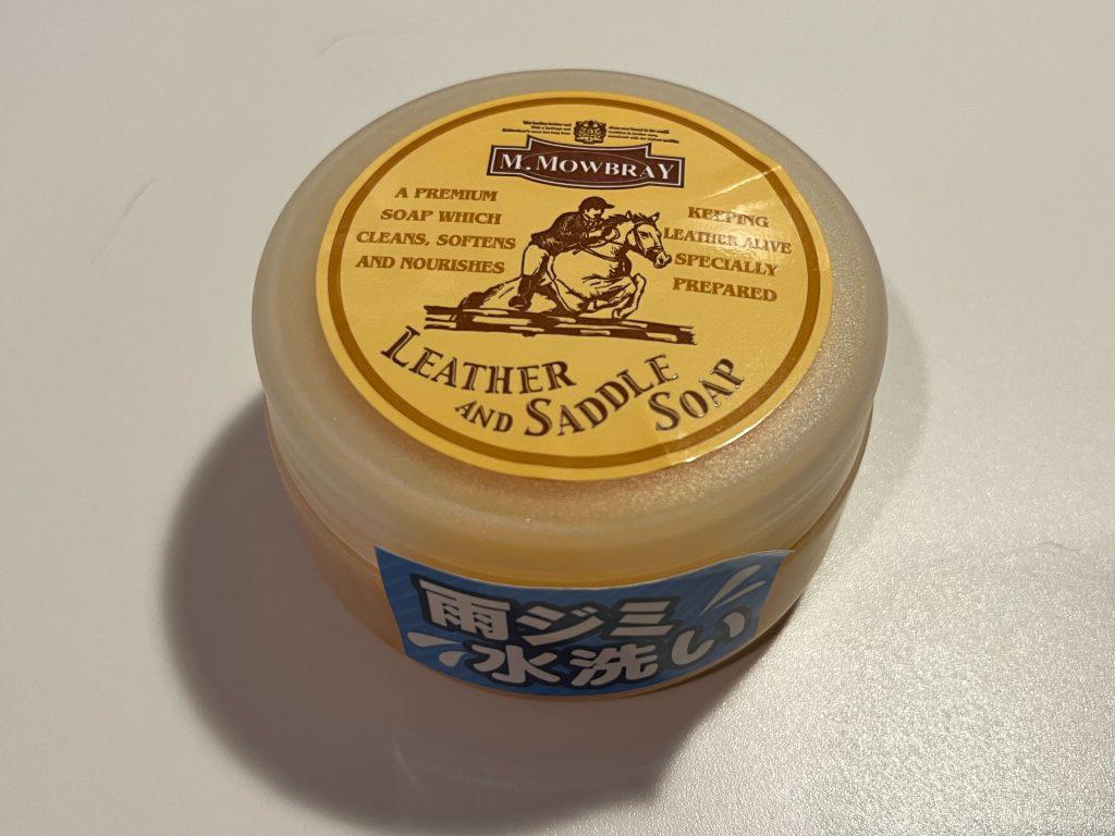 そこで、頭にほわわんと浮かんだのが、「サドルソープ」。皮革の柔軟性を保つための成分を含んだスムースレザーの皮革用石鹸です。手を洗う普通の石鹸と違い、通常は乾燥すると硬く仕上がる皮革もしっとりソフトに仕上がります。雨ジミ・塩汗・皮革の型崩れの際に最適なのです。